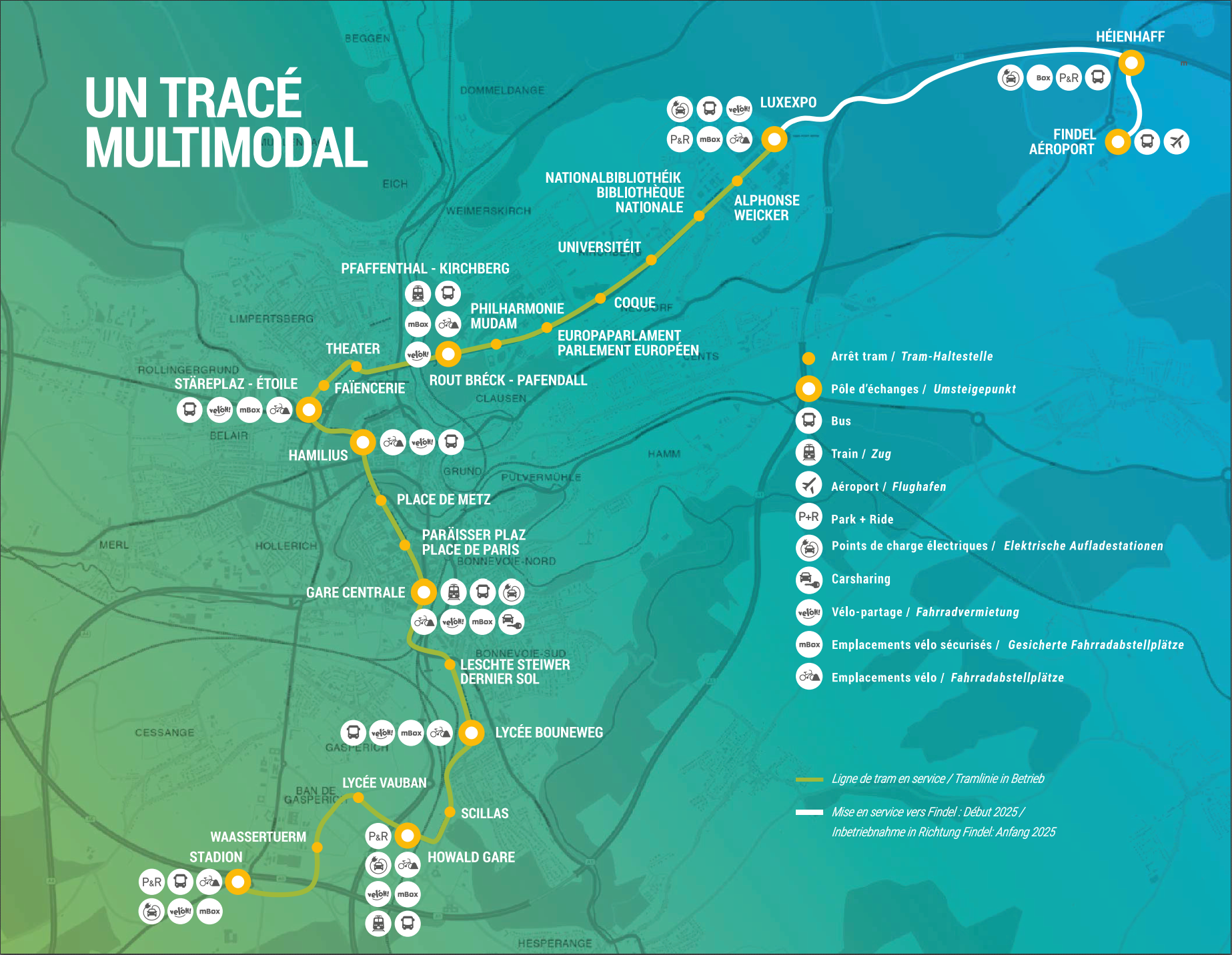 LUXTRAM S.A., mit staatlichem Kapital, entwirft, baut und betreibt das Straßenbahnnetz.Seit dem 2. März 2025 verkehrt die Straßenbahn auf der gesamten 16 km langen Strecke der Linie 1: Findel-Luxembourg Airport - Stadion - Findel-Luxembourg Airport